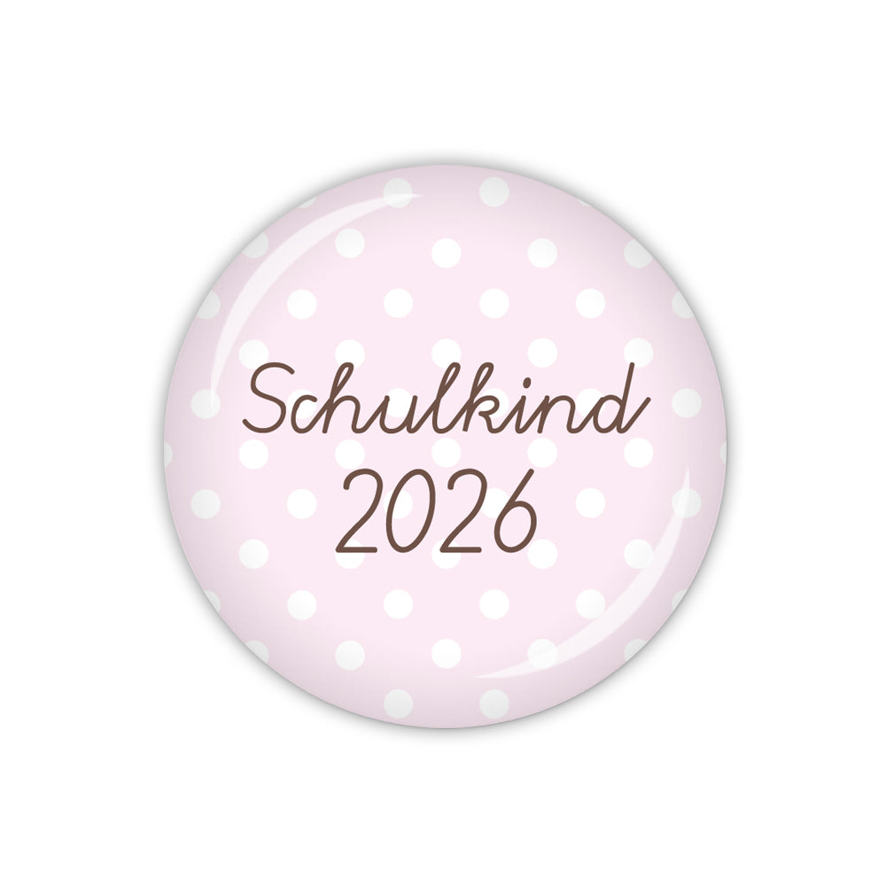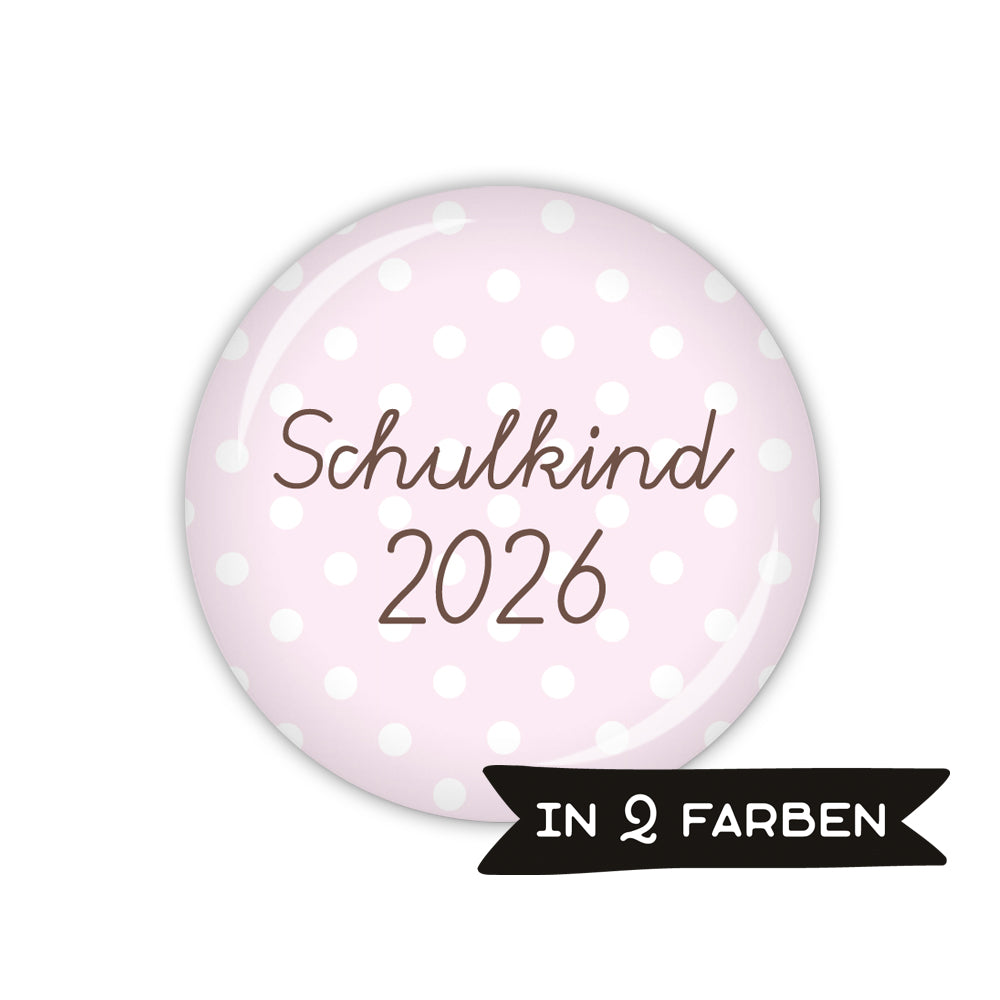 Button mit dem Schriftzug 'Schulkind 2026' auf wahlweise rosa oder hellblauem Hintergrund mit weißen Pünktchen.